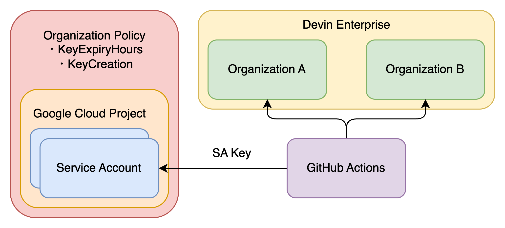 しかし前提として、メルカリではGoogle Cloud公式のベストプラクティスに従い、Organization Policyでサービスアカウントキーの発行を一律禁止しています。このためDevin専用のGoogle Cloud Projectを設け、さらにiam.serviceAccountKeyExpiryHoursを追加のOrganization Policyとして設定しました。これにより、自動化が停止した場合でもサービスアカウントキーは一定期間で無効化されます。