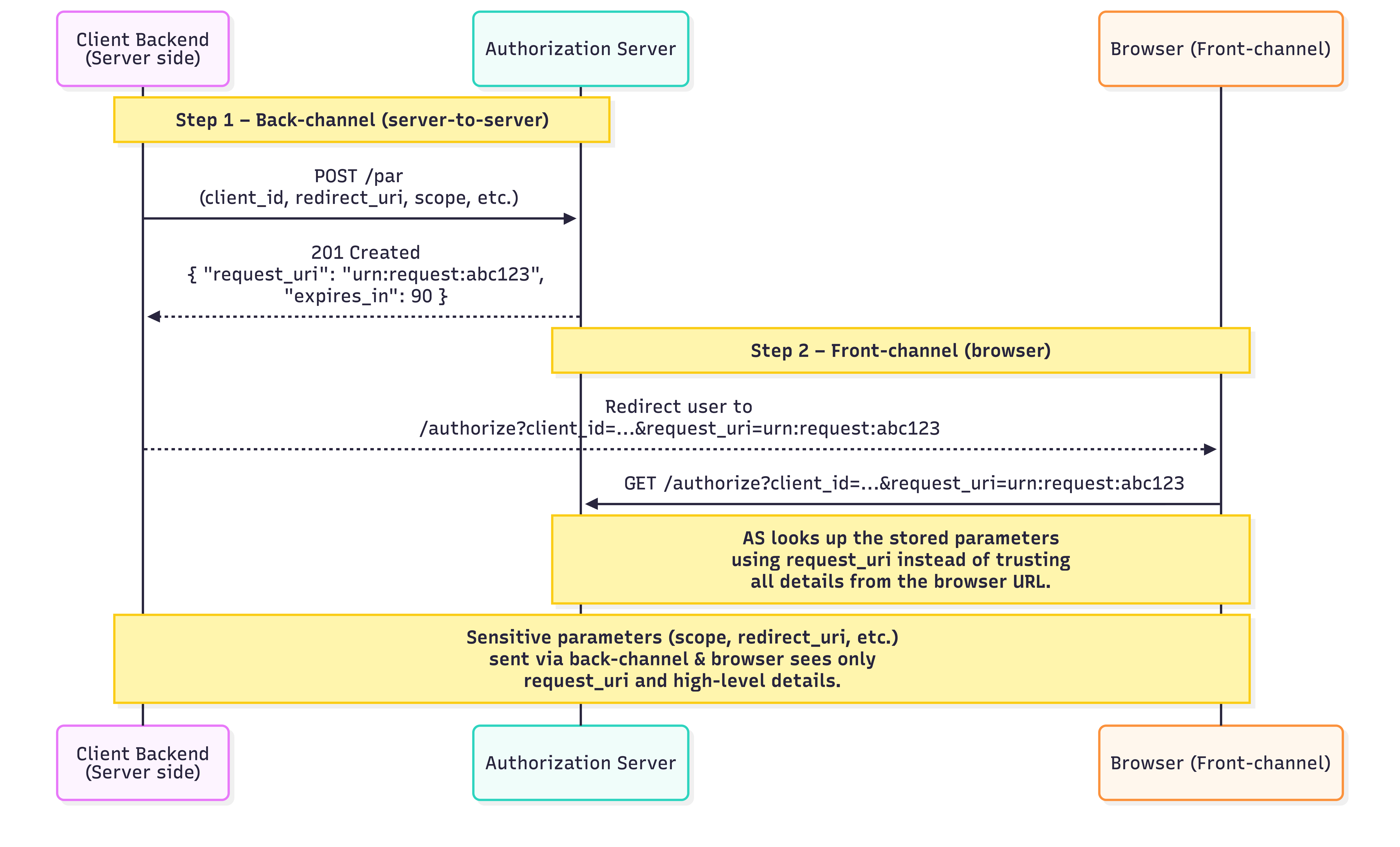 This moves sensitive request details from the public browser (front channel) to a secure server-to-server (back channel), preventing exposure, tampering, and URL length issues. This is only a general idea about PAR, as it also involves other checks and requirements that need to be satisfied. More details are in the official RFC page.