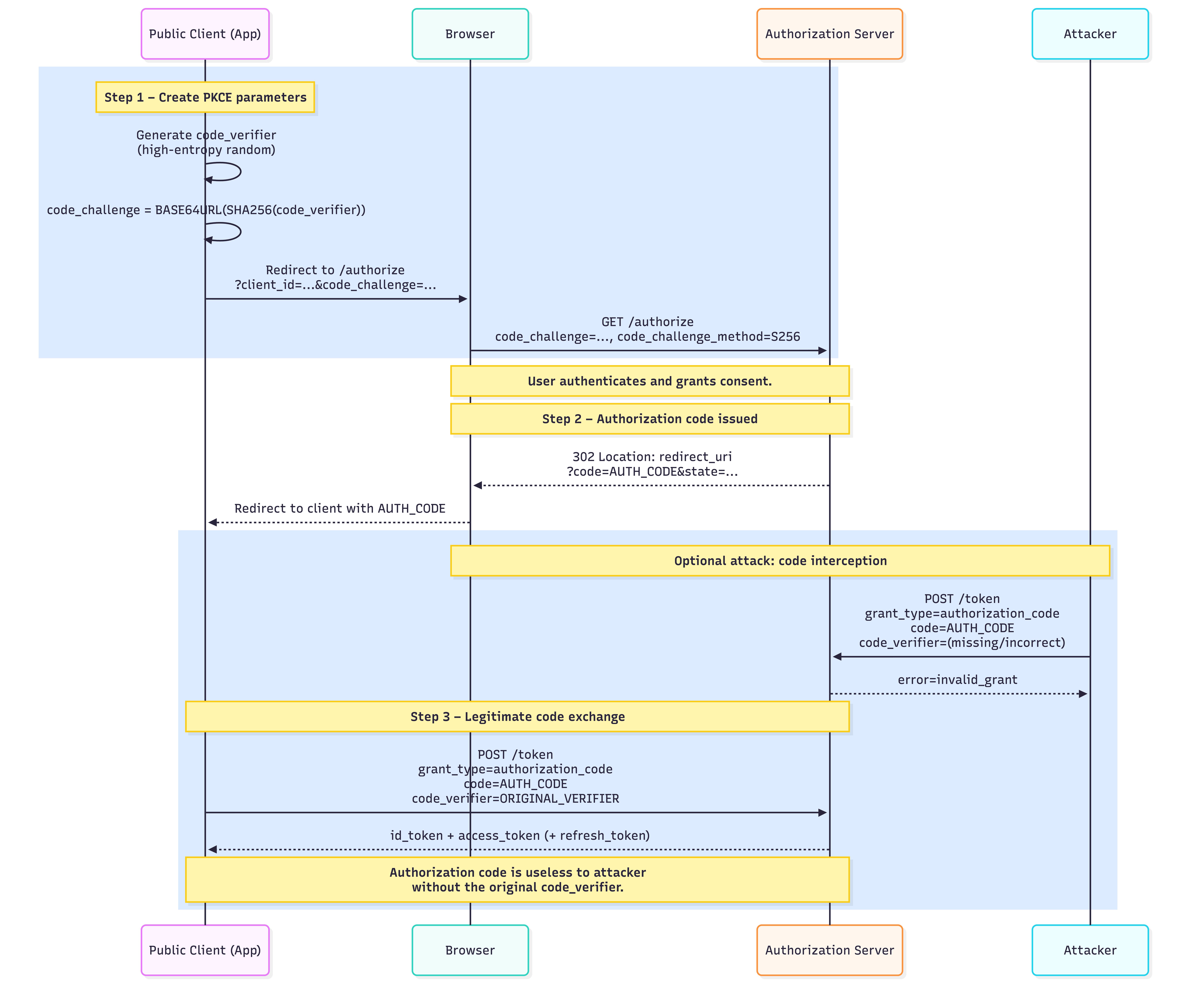 The Proof Key for Code Exchange (PKCE) flow is primarily designed to mitigate authorization code interception. These attacks are particularly common in mobile applications for example, in cases of deep-link hijacking. PKCE introduces an extra layer of defense through a code verification mechanism.